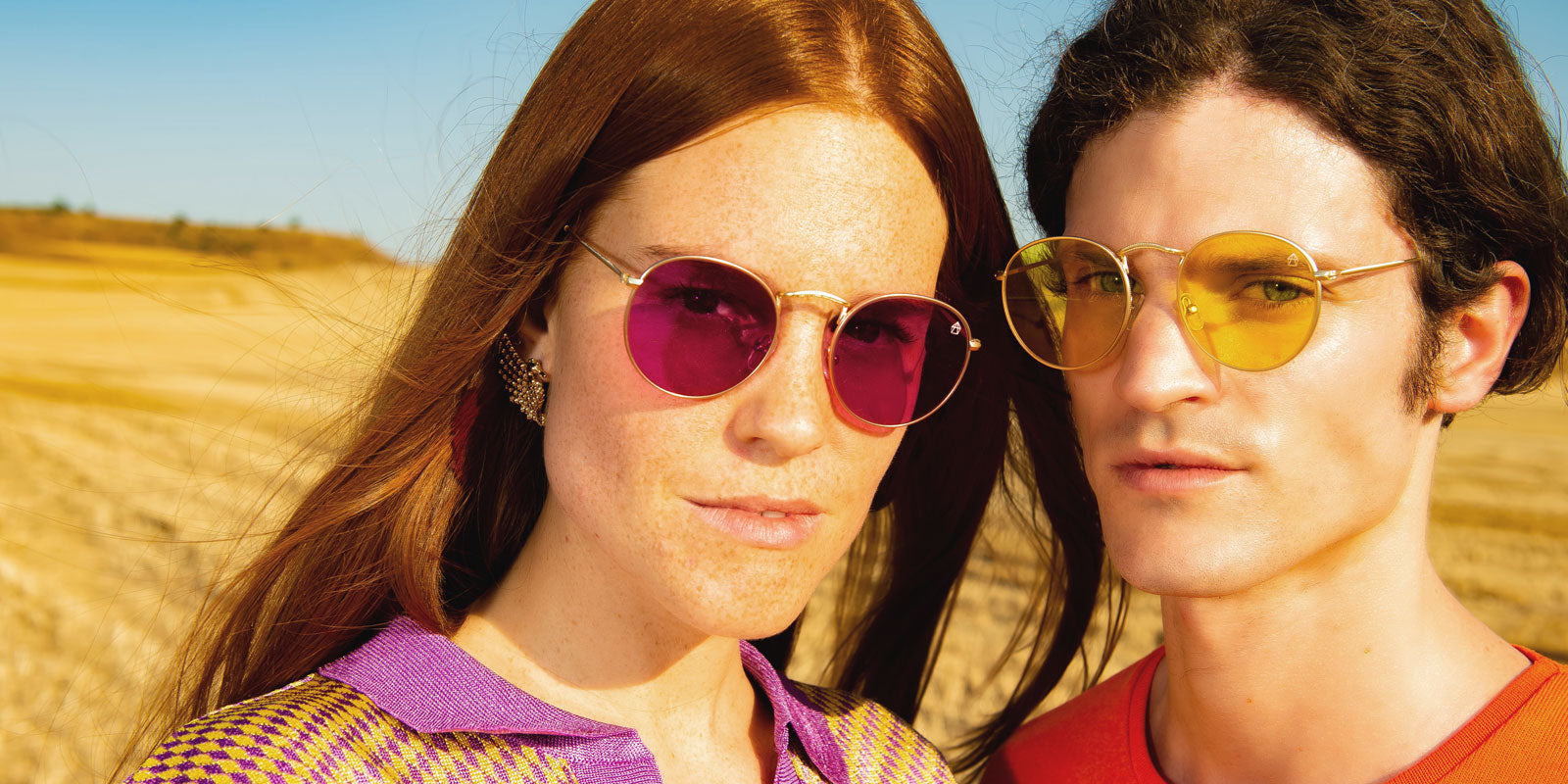 Gafas con lentes moradas. Montura ligera en metal dorado mate.